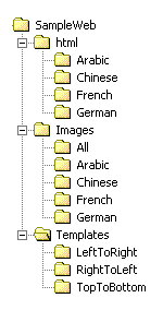 We see that pages and images have been grouped by language, that some images apply to all locales (e.g. the company logo) but that templates are divided by presentation direction. Templates do not contain any text; they simply specify how the text will be presented (fonts and layout). We see with this example that templates are not really "locale-independent", strongly suggesting once again that "locale-independence" is a misleading concept. We can also imagine other locale-dependency classes, for example, languages requiring phonetic search capabilities or locales where anything even remotely sexy is inappropriate.